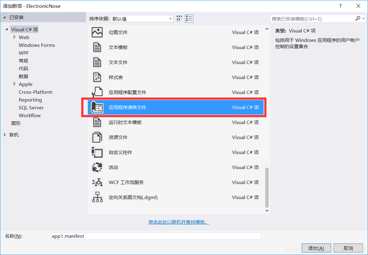 1、首先在项目中添加应用程序清单文件,app.manifest。