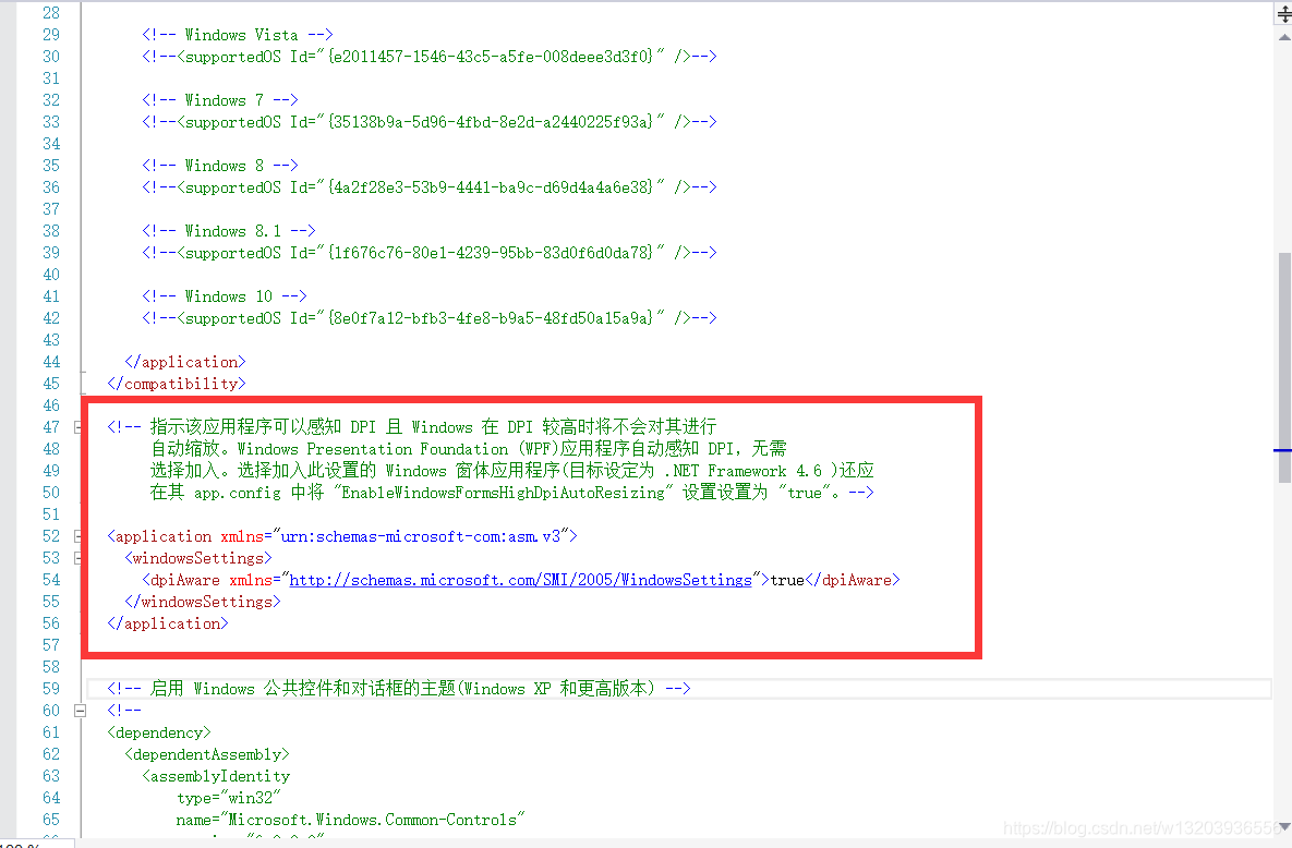 2、然后放开其中一段注释:指示该应用程序可以感知 DPI 且 Windows 在 DPI 较高时将不会对其进行自动缩放。